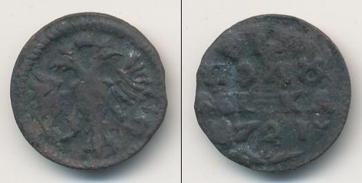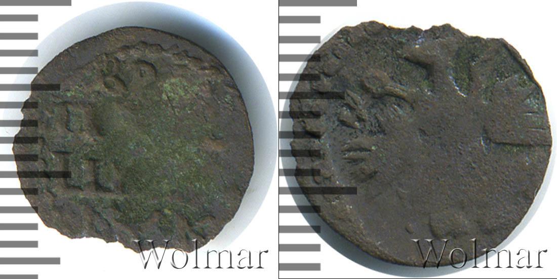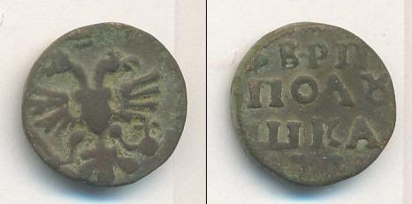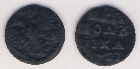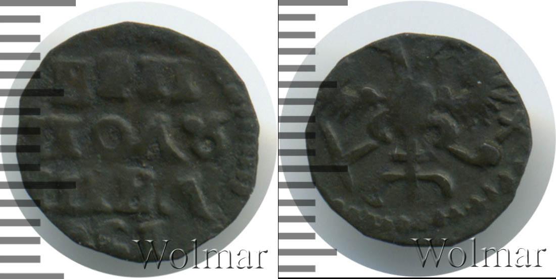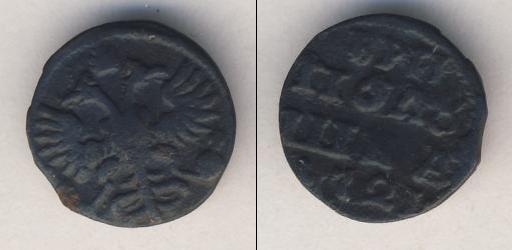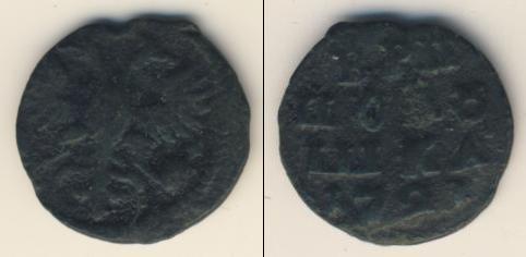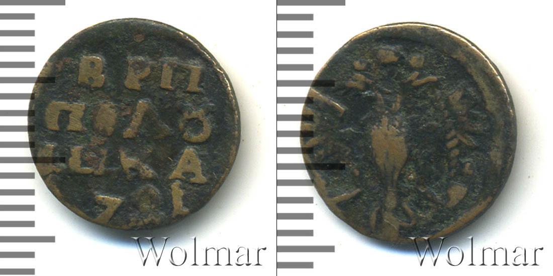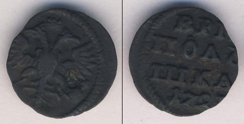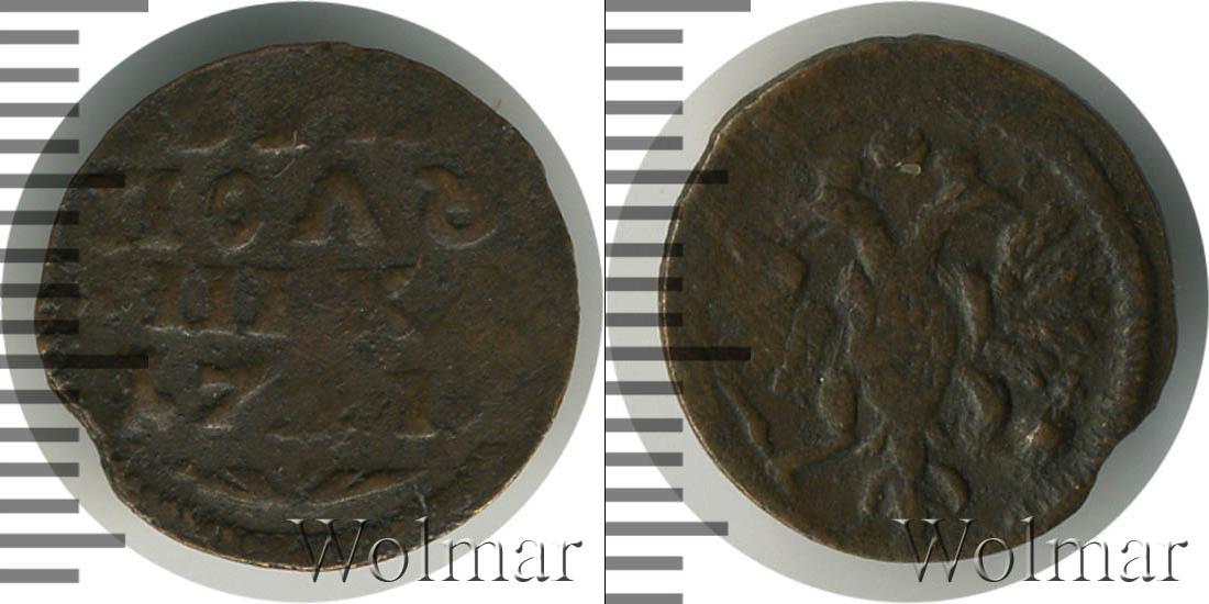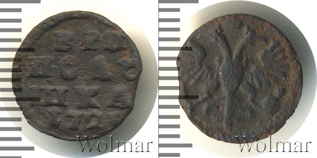 По краю диска монеты идет зубчатый ободок, а в центре изображен двуглавый орел, сжимающий в лапах скипетр и державу. Это Государственный герб России (периода правления первого русского императора Петра Великого).