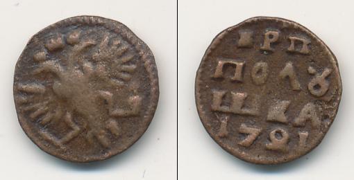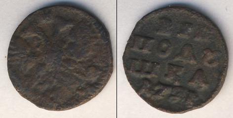 Вверху монеты выгравировано: «ВРП». Ниже мы видим отметки о номинале и дате эмиссии монеты «ПОЛУШКА 1721». Год выпуска партии указан на старославянском языке. Край диска монеты оформлен аналогично аверсу – зубчатый ободок.