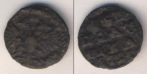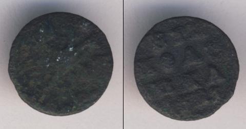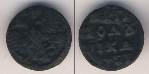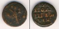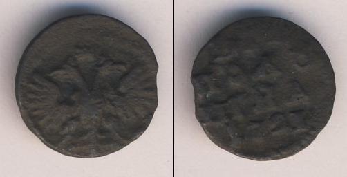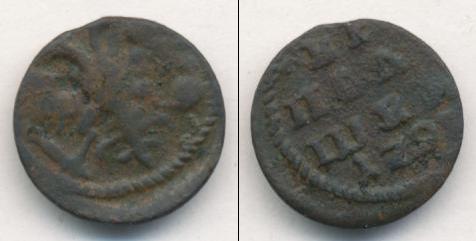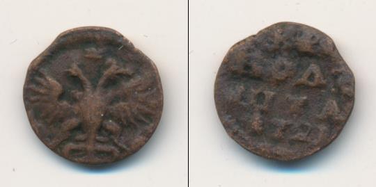 По краю диска монеты идет зубчатый ободок, а в центре изображен двуглавый орел, сжимающий в лапах скипетр и державу. Это Государственный герб России (периода правления первого русского императора Петра Великого).
