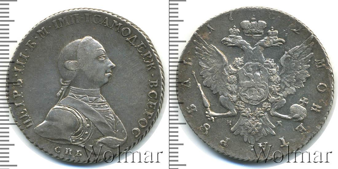 По центру диска гербовая эмблема Российской Империи. Над ней отмечен год чеканки монеты «1762». В нижней части диска вдоль канта расположена надпись: «РУБЛЬ МОНЕТА». Это указание на номинал. В центре также отмечены инициалы минцмейстера «ДМ».