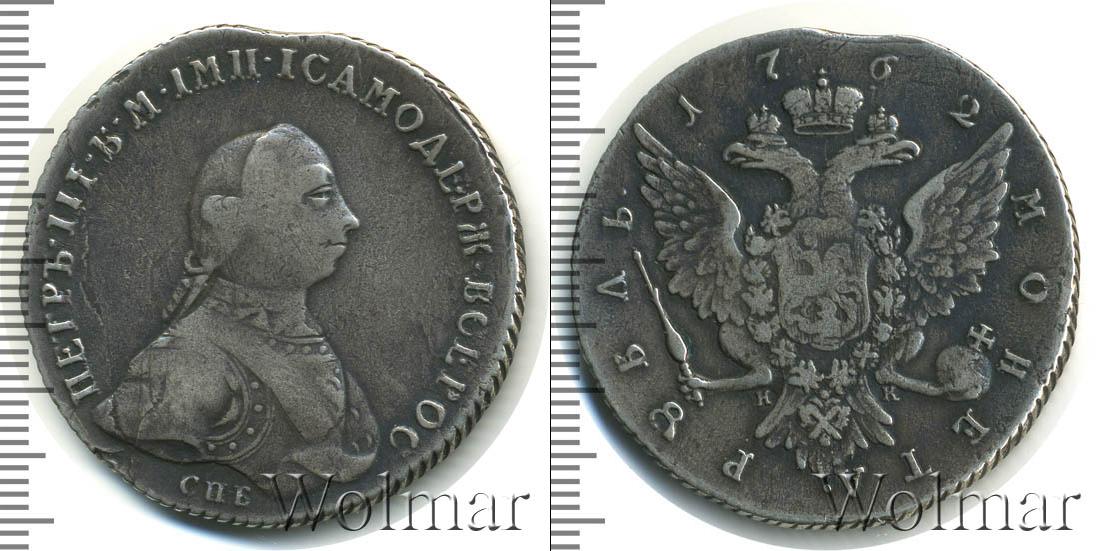 По центру диска гербовая эмблема Российской Империи. Над ней отмечен год чеканки монеты «1762». В нижней части диска вдоль канта расположена надпись: «РУБЛЬ МОНЕТА». Это указание на номинал. В центре также отмечены инициалы минцмейстера «ДМ».