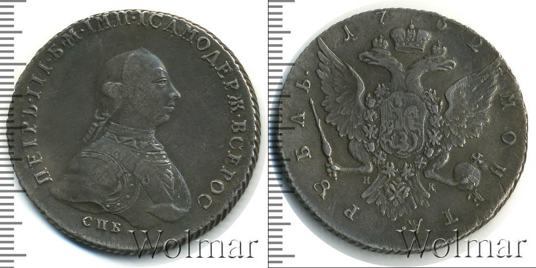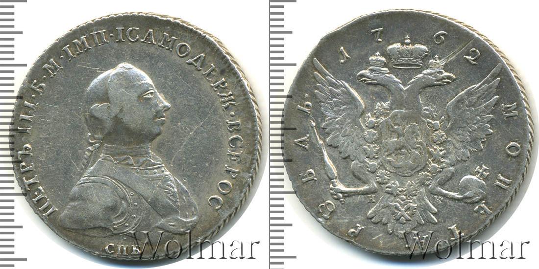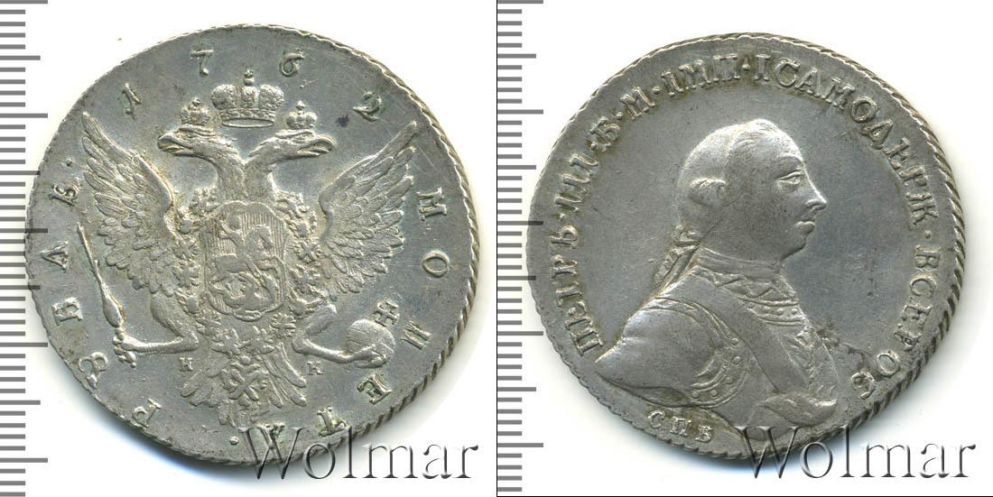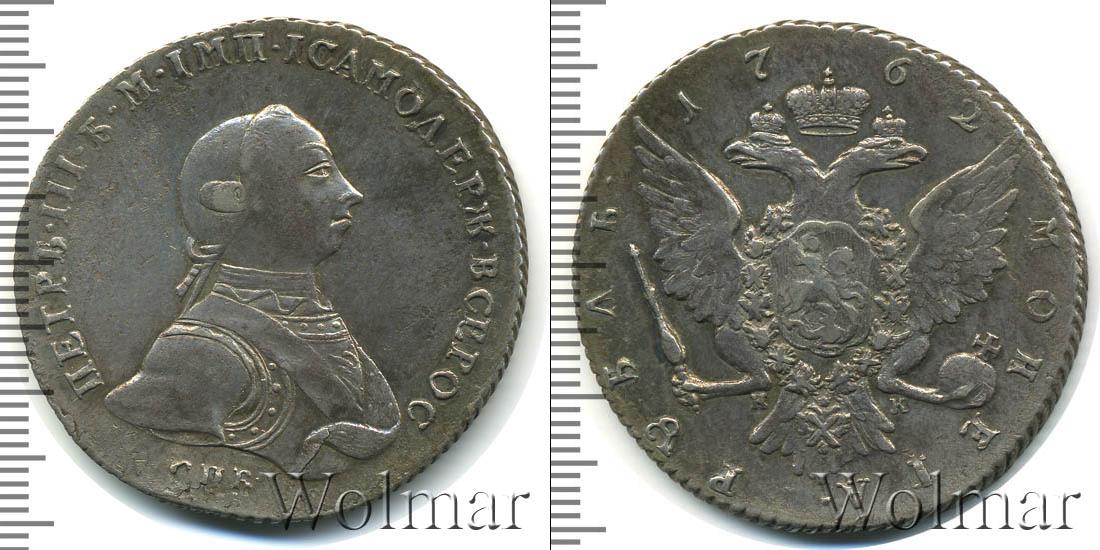 По центру диска гербовая эмблема Российской Империи. Над ней отмечен год чеканки монеты «1762». В нижней части диска вдоль канта расположена надпись: «РУБЛЬ МОНЕТА». Это указание на номинал. В центре также отмечены инициалы минцмейстера «ДМ».