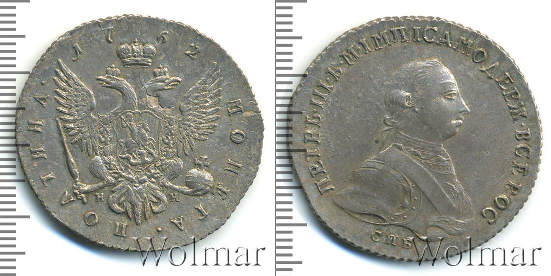 Представлена гербовая эмблема России. Под ним указаны инициалы минцмейстера «НК». Вверху дата эмиссии монеты «1762». По краю диска слева выгравировано «ПОЛТИНА», а справа – «МОНЕТА». Вдоль канта – зубчатый ободок.