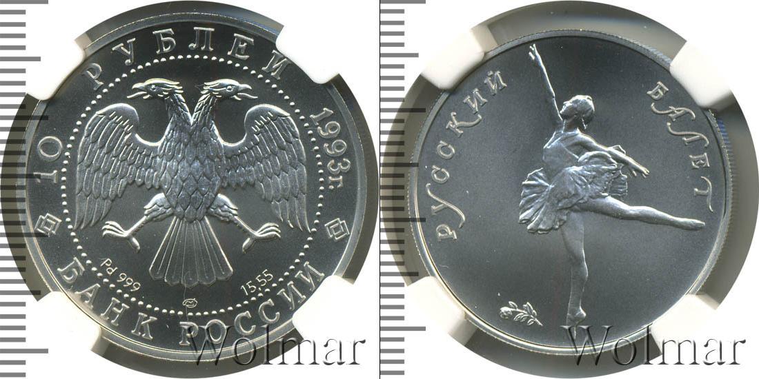 Гравировка двуглавого орла, эмблемы ЦБРФ. Вверху полукругом начертано: 10 РУБЛЕЙ 1993 г. Эмблему обрамляет узор из множества точек. Внутри него сделаны отметки: тип драгметалла и проба сплава, знак монетного двора и содержание чистого металла. Внизу распо