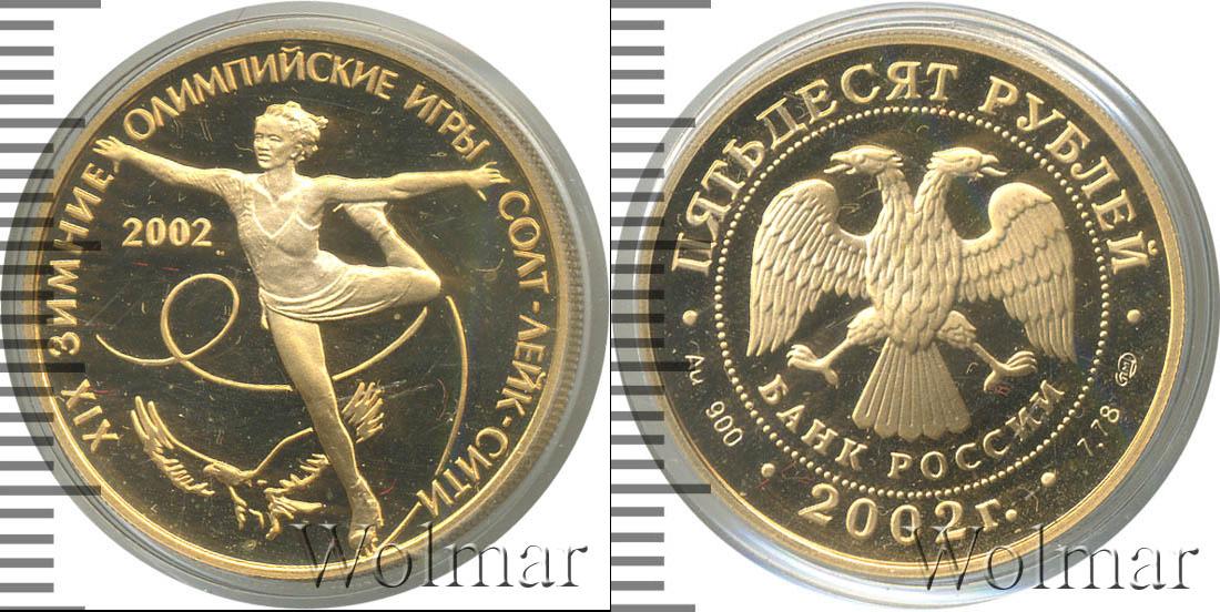 Монета абсолютно без дефектов. В центре - фигуристка, внизу - парящий орел. Тираж: 3 000. 900 проба. Диаметр 22,6 мм. 50 рублей. XIX зимние Олимпийские игры 2002 г., Солт-Лейк-Сити, США СПМД
