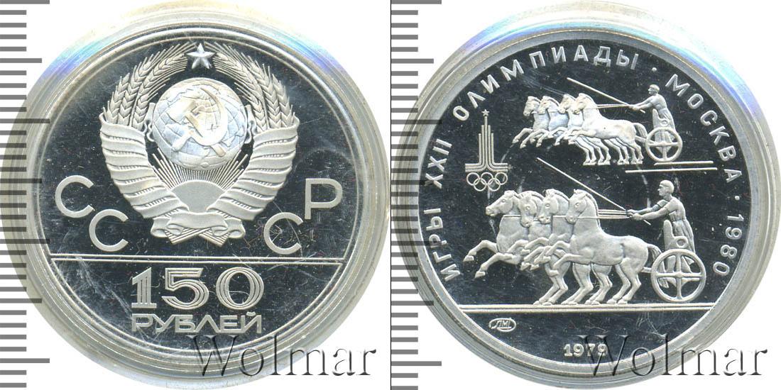 В футляре. 999 проба. Диаметр 28,6 мм. 150 рублей. Античные колесницы. Игры XXII Олимпиады ЛМД