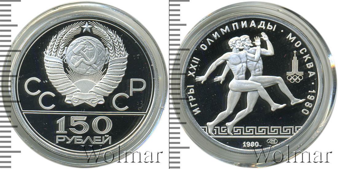 999 проба. Диаметр 28,6 мм. 150 рублей. Античные бегуны. Игры XXII Олимпиады ЛМД