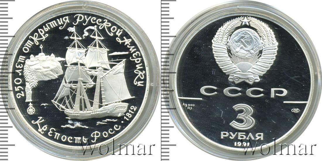 Вверху изображен герб Советского Союза, под ним надпись «СССР», в нижней части отчеканен номинал и год эмиссии в 3 строки «3 РУБЛЯ 1991». Под левой чертой обозначение драгметалла, из которого изготовлена монета, и проба «Ag 900», ниже указано «31,1». Под
