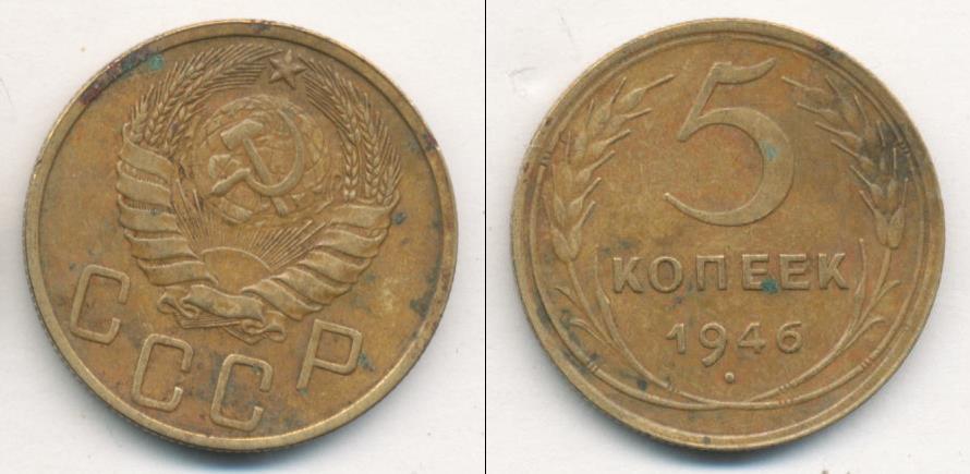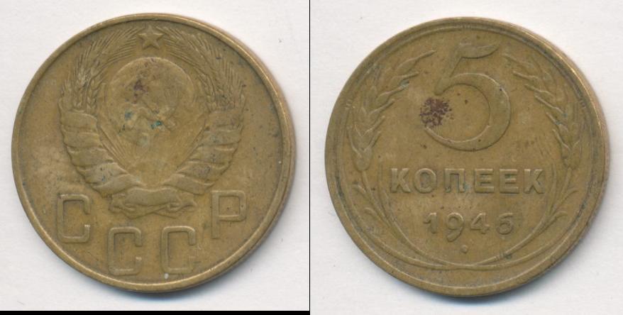 Отмечены дата эмиссии и номинал монеты: 5 КОПЕЕК 1946 (большая цифра «5»). Ниже выпуклая точка и растительный орнамент из пшеничных колосьев. А также тонкий ободок по краю диска.