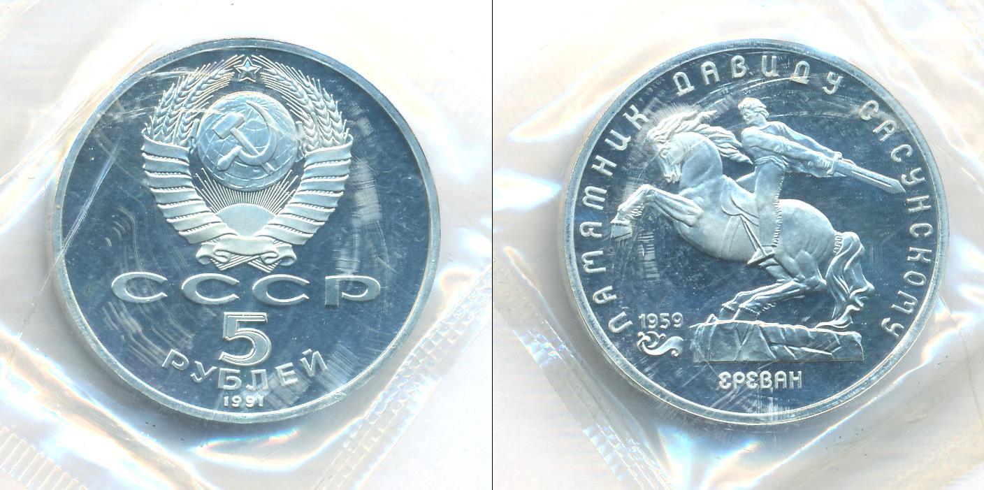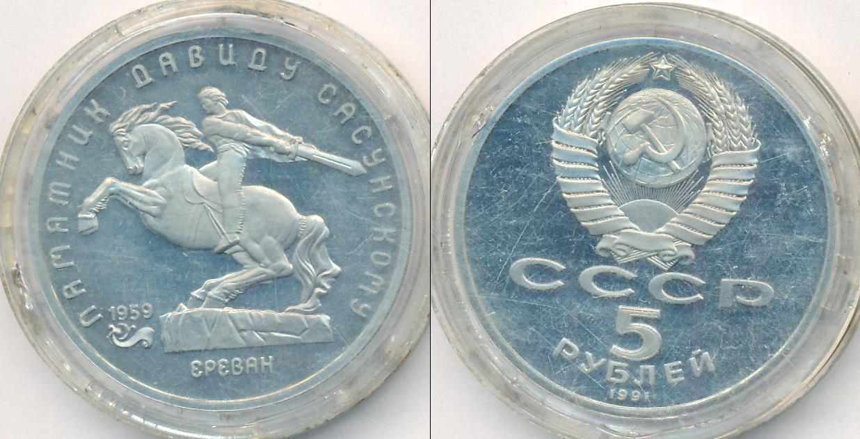 Царапинки, патина, пятна 5 рублей Памятник Давиду Сасунскому в Ереване