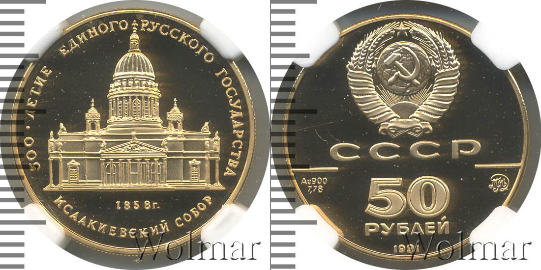 Тираж: 25 000. 900 проба. Диаметр 22,6 мм. 50 рублей. Исакиевский собор ММД