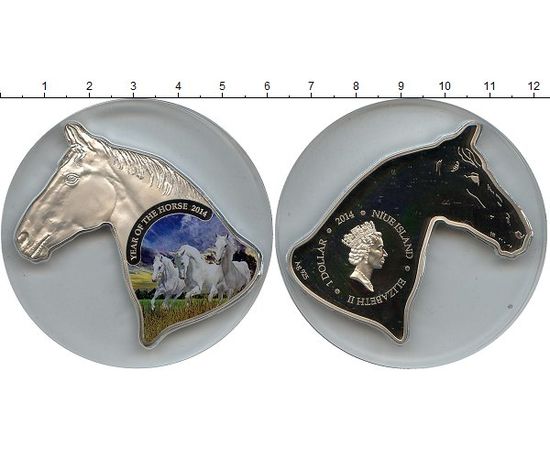 Монета выполнена в форме конской головы – на поверхности рельефно изображены глаза, грива, пасть и ноздри. В области шеи отчеканен профиль королевы Великобритании Елизаветы II, вокруг него, разделенные 4-мя точками, идут надписи «2014» (год чеканки), «NUTE ISLAND», «ELIZABETH II» и номинал «1DOLLAR». Внизу возле края выбита проба серебра в монете «Ag 925».