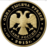 Изображение двуглавого орла по центру диска монеты. А ниже соответствующая надпись: БАНК РОССИИ. Вверху указан номинал ОДНА ТЫСЯЧА РУБЛЕЙ, а внизу дата эмиссии 2015 г. Слева и справа от даты отмечены тип металла, проба сплава, содержание чистого золота и